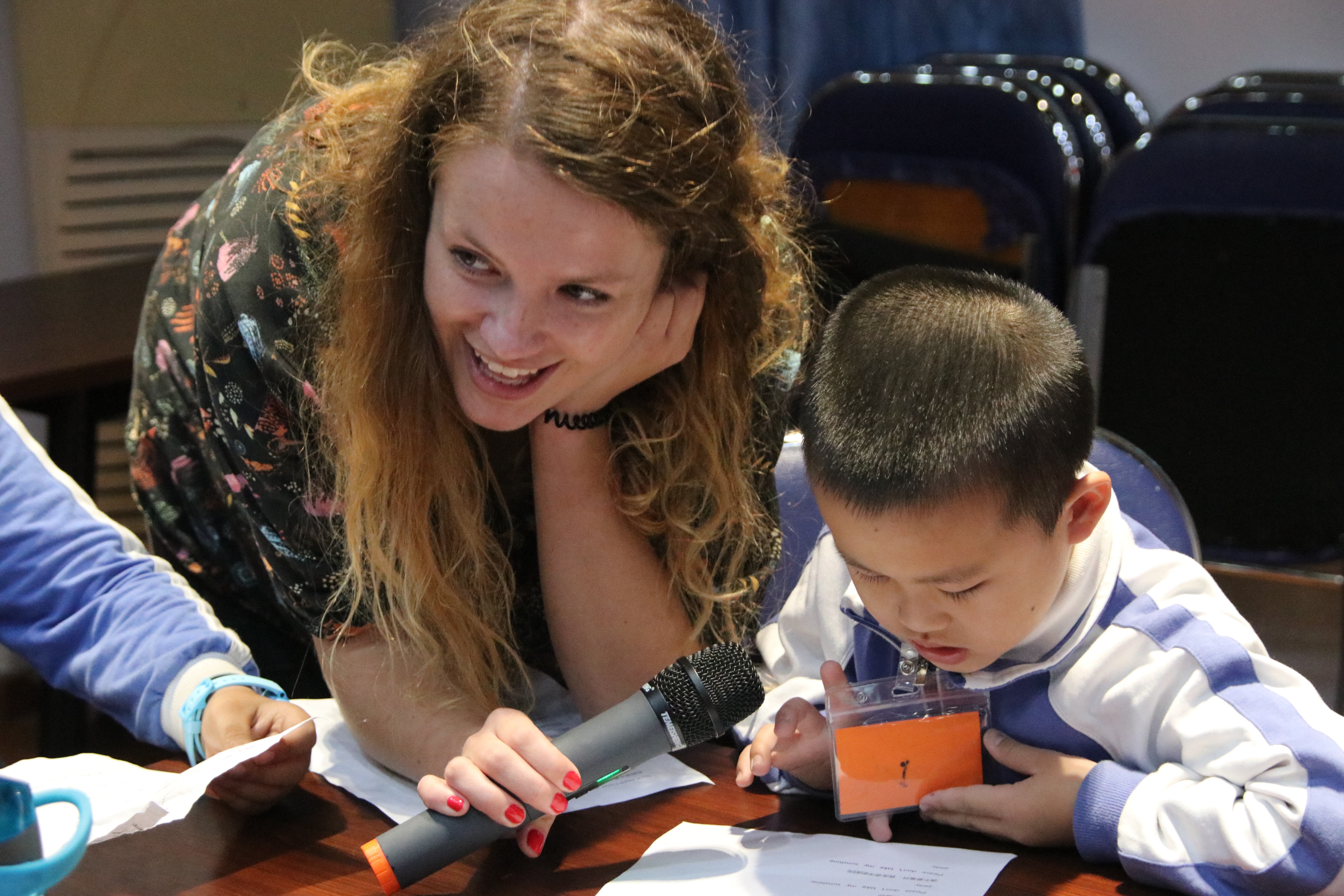 After Peter’s explanation, the children were more familiar with the lyrics. Next, Noam and Ewa went to the desks to sing the song with students line by line. Immediately, the room was full of singing voices. It was difficult for some children to pronounce each word well so Noam and Ewa helped them patiently. With the help of the two lovely teachers, the progress the children were making was obvious.