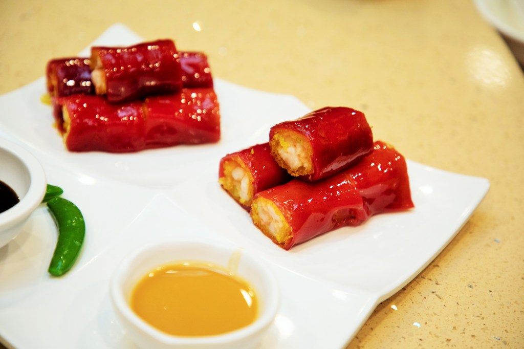 - 金沙鲜虾红米肠 (jīn shā hǎi xiā hóng mǐ cháng), a red rice sausage with crunchy shrimp inside