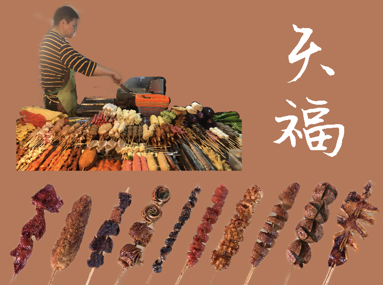 So what’s chuanchuan? As you can see from the picture, this snack contains a variety of meats and vegetables including squid, escargot, mushroom, eggplant, and many others. After being fried in an oil pot, the chuanchuan will be put on an iron clamp to pick it out, and then sprinkle on top of it spice powder, cumin powder, and other seasonings. Just come and give it a try!