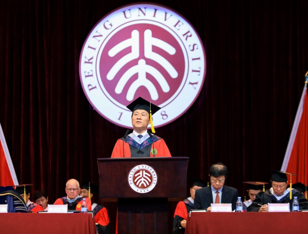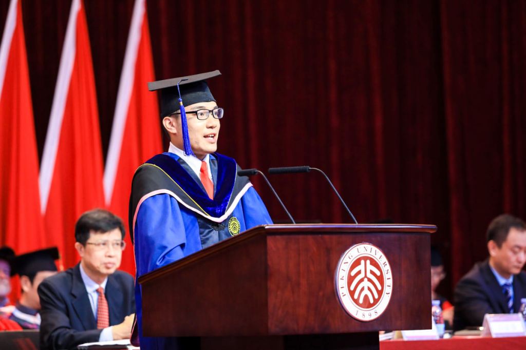 The first speaker was student representative Zhu Weihao, a graduating student from Peking University HSBC Business School (PHBS). In a speech appropriately titled Create a Hard-core Version of Yourself, he recalled the continuous struggle each student had to endure to reach this happy occasion. Whether it was sleepless nights in labs, endless piles of cases to read, or early morning training sessions, each student encountered significant hardship. Weihao reminded the graduates that this hardship crafted them into the hard-working people they are today. And he encouraged his peers to continue to not shy away from hardship in pursuit of their dreams and in service to their country. As PKU graduates, they should continue to develop the hard-core versions of themselves.