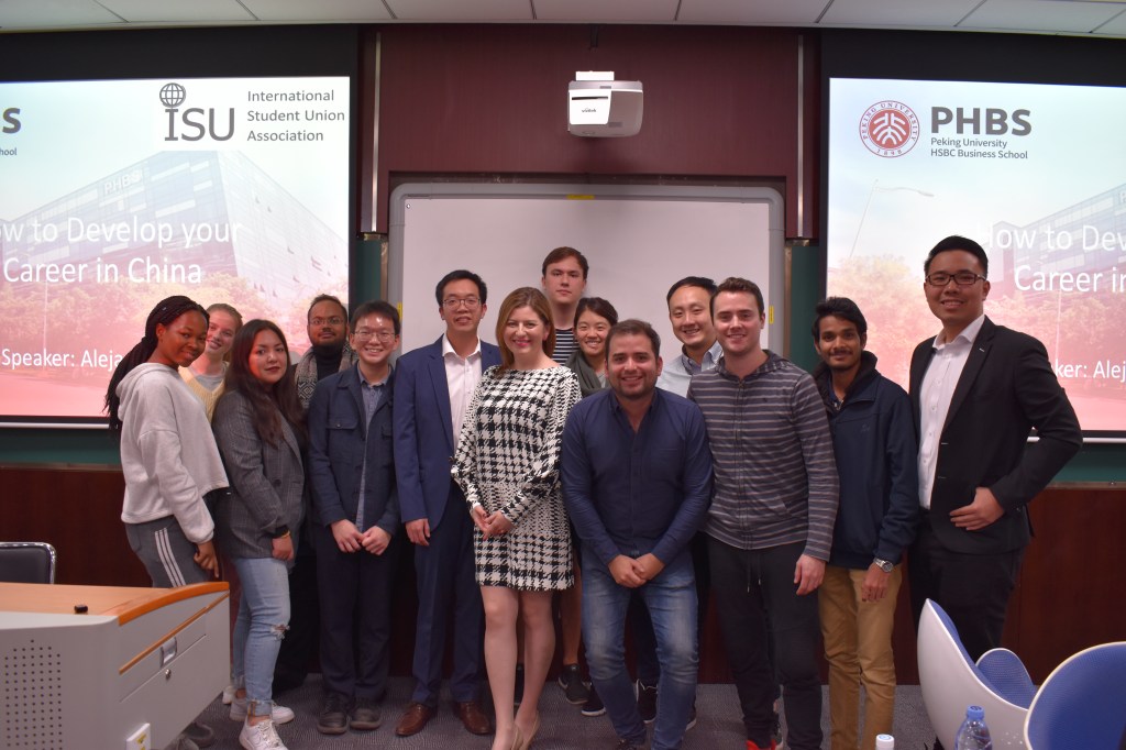 This was the first “Developing Your Career in China” event organized by the ISU. Many students at PHBS are interested in internship opportunities and remaining in China after they graduate. José Shin, first year management student and ISU committee member, said this is what lead him to reach out to fellow Spanish speaker Ms. Jara: “One of the objectives of ISU is to offer knowledge and job opportunities to the PHBS international students, this purpose led me to meet Alejandra through LinkedIn. What caught my attention about her profile was that she is an Entrepreneur and developed her career here in China. Sharing Spanish as our mother tongue helped us form a good relationship.”