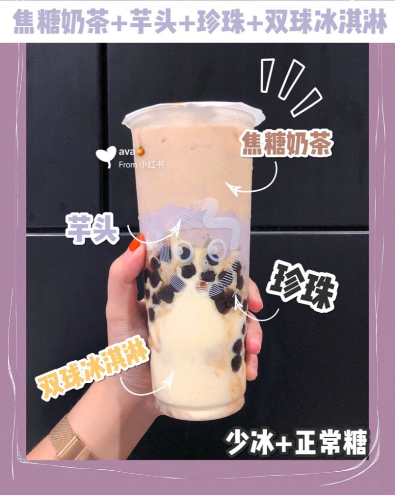 Jasmine milk tea + Double ice cream + Taro: the favor of taro, the ice cream and milk mix together and spark your taste bud. If you like milk, taro and ice cream, you should have a try!