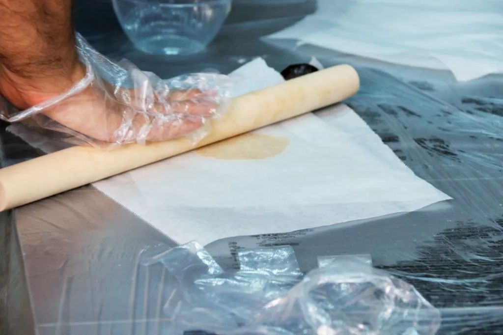 Put the dough on the sheet of baking paper and then roll it with a rolling pin. Remember not to make it too thin, otherwise it may break and not cover the filling. If you are a big fan of matcha or would like to make a colorful mooncake, adding matcha powder should be to your liking.