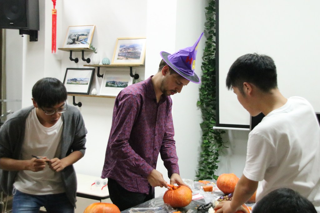Li Yang (from SECE, PKU): “I was so happy to join as an assistant because it would be a good time for me to enjoy. Nathan, the teacher who is responsible for this event, prepared everything well before 19:00. Everyone started their works after Nathan showed how to use the tools and how to carve. Everyone was very creative. They made many kinds of pumpkins lamp. Everyone had fun the whole night. It’s a great Halloween celebration.“