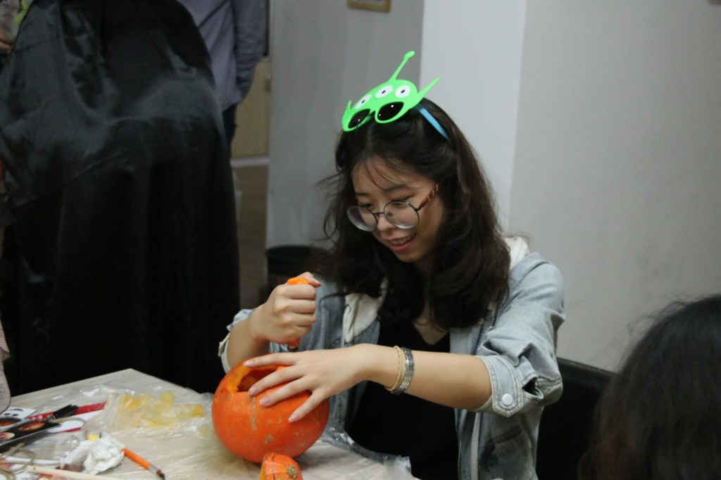 It was not easy at the beginning. The pumpkins first must be hollowed out. Some thick pumpkins made the task especially difficult. However, this little trouble would not be a challenge for our students. Participants discovered they had special skills in carving pumpkins. We saw cute ghosts, scary and humorous faces, cats, bats, and even a PKU logo come to life.