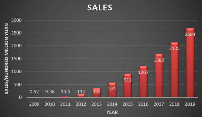 It can be seen from Figure 1 and Figure 2, the sales and the number of participating merchants are increasing year by year on November 11th. Sales rose from 52 million yuan in 2009 to 268.4 billion yuan in 2019. The initial number of participating merchants is just 27, and now the number is up to 180000. Chinese e-commerce platforms, such as Taobao, Jingdong and Vipshop, compete in this carnival. There is no doubt that Single’s Day has become a national shopping festival in China. It reflects China’s strong domestic demand and the development of e-commerce.
