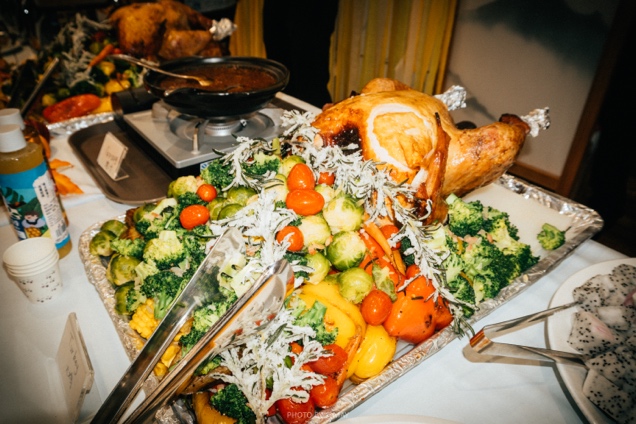 A traditional Thanksgiving feast of turkey and much more was offered. Much of the food was prepared by the chef and cooks of Shang Shufang, who also graciously hosted the event. The dessert was prepared by Baekerei Thomas, a German bakery in Shekou. People were soon lining up to get food and then not long after going back for more!