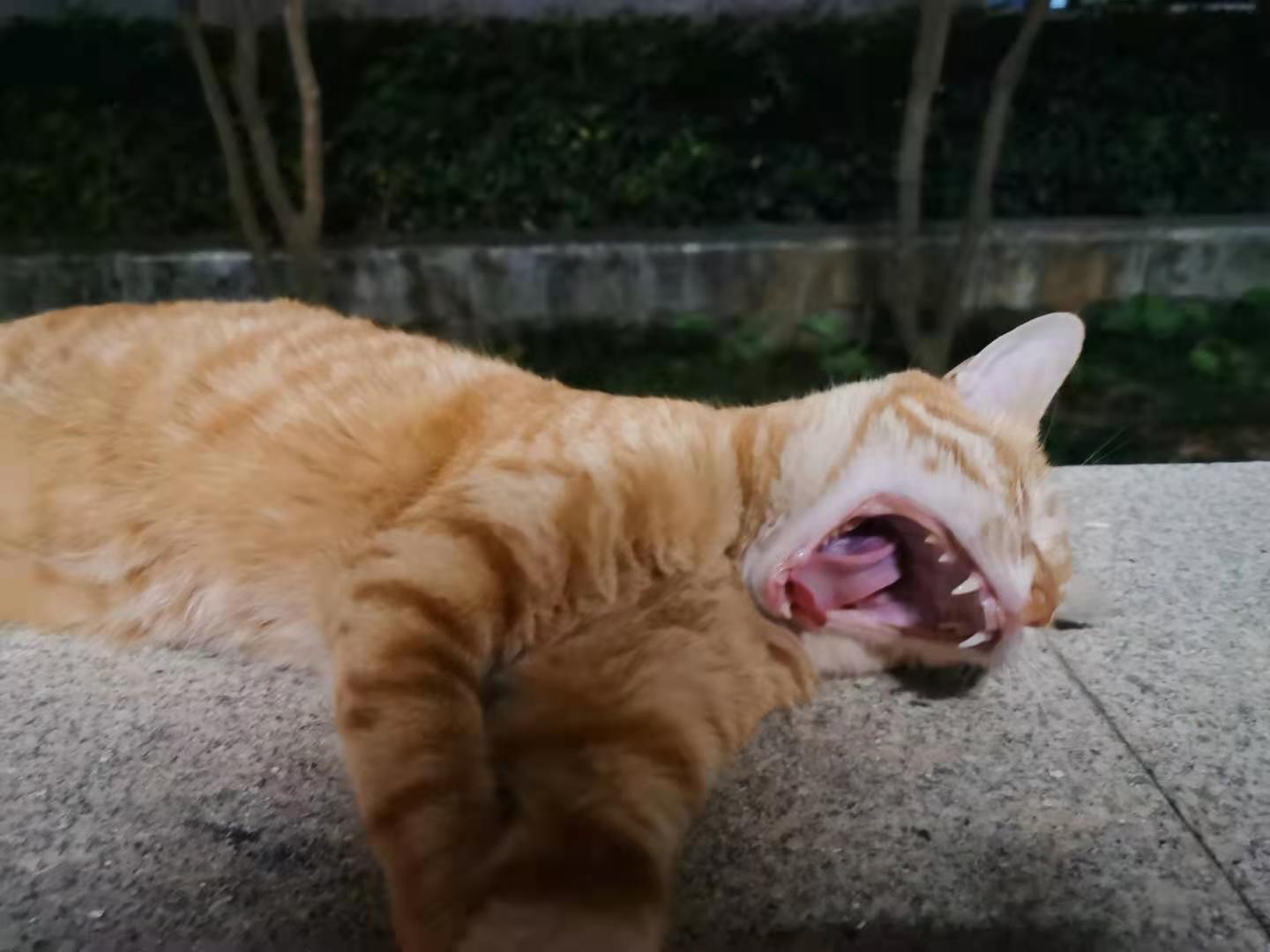 At the PKUSZ sports field, there are 7 or 8 cats, including some kittens that were born recently. There are strong male cats with white and yellow stripes and relatively thin female cats. Every night, they watch the people running back and forth on the playground. When this orange cat sees people, she likes to walk around them a few times and rub against them. When you prepare some food for her, all the cats will swarm around.
